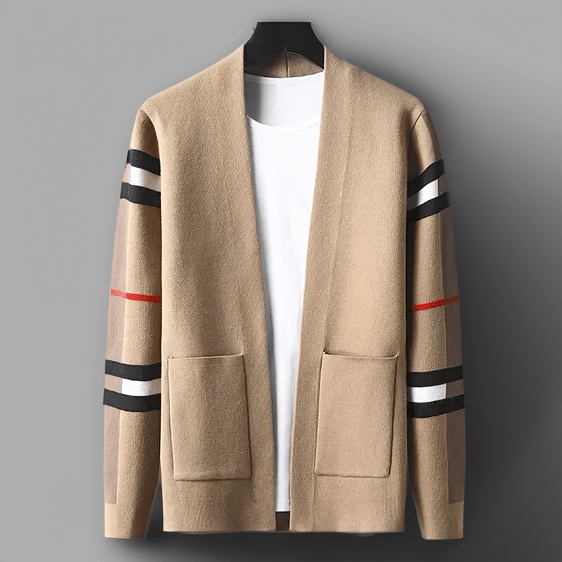 A cardigan that speaks in details, not volume. Crafted from a premium merino wool blend, its clean open front, deep pockets, and striped sleeves balance subtlety with bold design. Lightweight yet structured — the perfect layer that carries both ease and elegance.