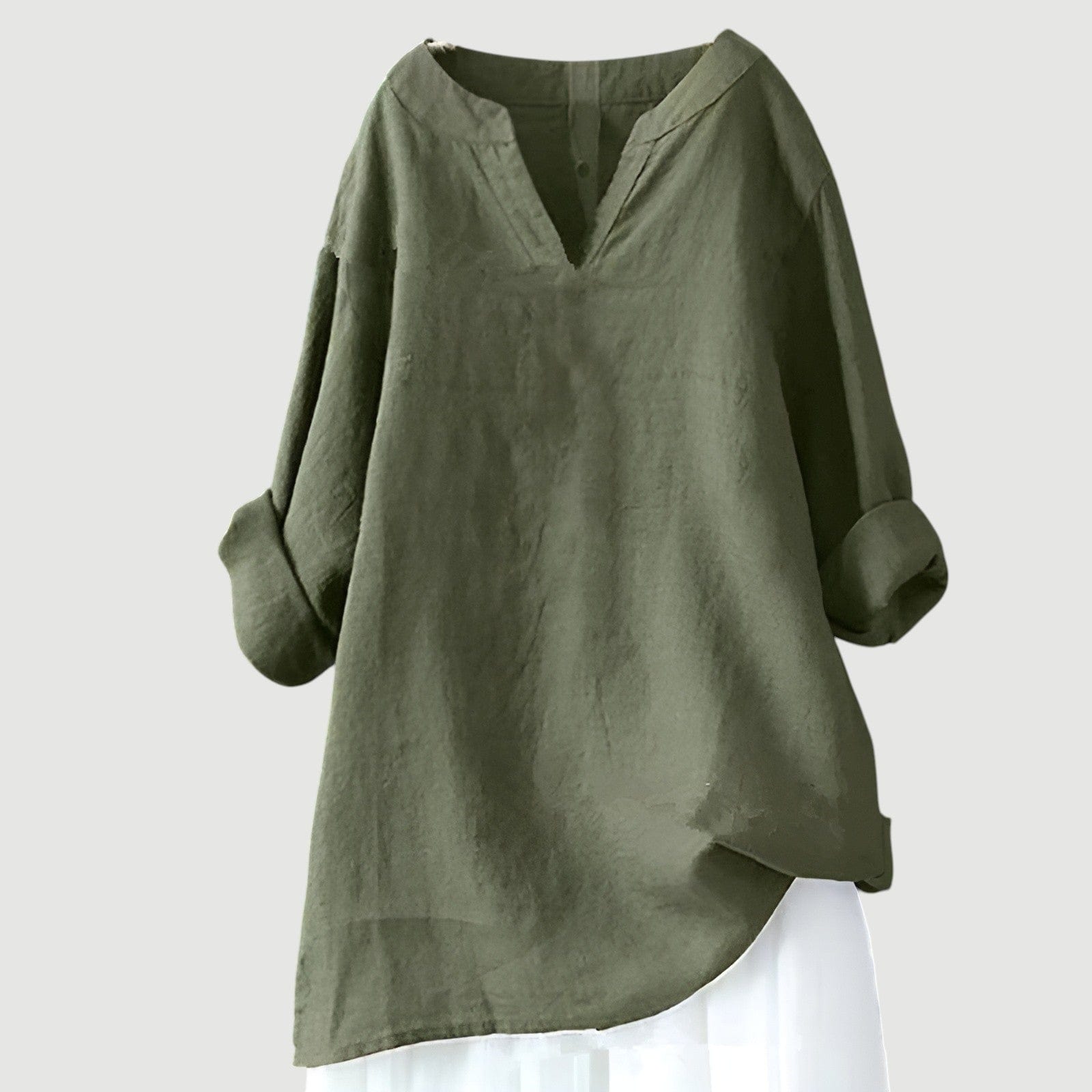 Crafted from a premium linen-cotton blend, this blouse drapes softly over your frame, keeping you cool and confident from morning markets to sunset soirees. Subtle notch detailing at the V-neck and a graceful curved hem add artful flair to every movement.